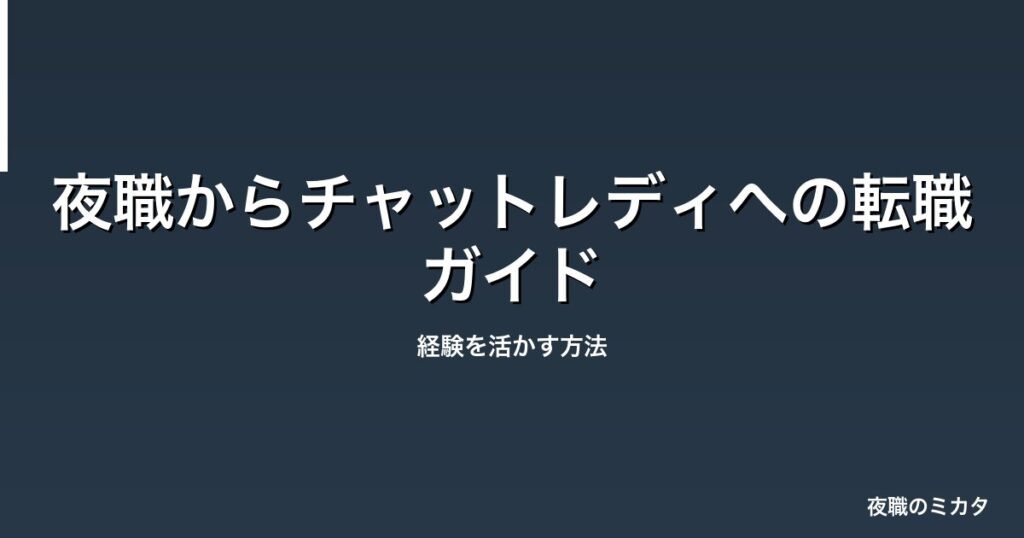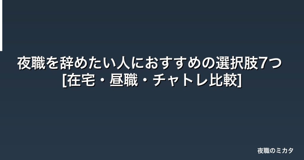 夜職を辞めたいと思っている人向けに、在宅ワーク・昼職・チャットレディなど7つの選択肢を月収・難易度・移行のしやすさで比較。自分に合った次のステップを見つけてください。 -