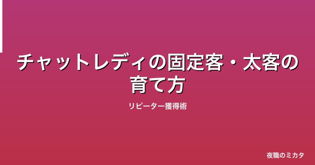 常連が収入を安定させる チャット率はほぼ常連の数で決まります。常連10人いれば毎回2〜3人は来てくれる計算です。 --- 常連獲得の5ステップ 1. 名前を呼ぶ — 入室即「○○さん!」 2. 前回の話を覚える — メモ必須 3. 次回予告 — 「次は○曜日の○時」 4. メ... -