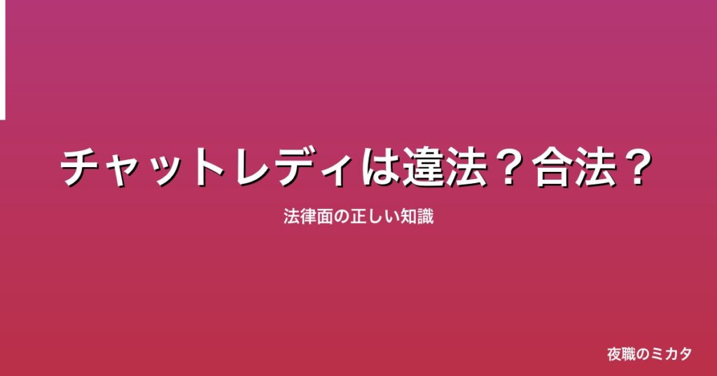 チャットレディは合法な仕事 結論から言えば、チャットレディは合法な仕事です。ただし、法律を正しく理解していないと違法行為に抵触するリスクがあります。チャットレディに関わる主な法律は「風営法(風俗営業等の規制及び業務の適正化等に関する法律)... -