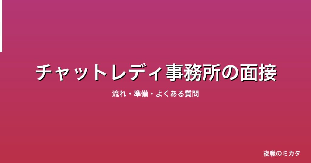 面接の一般的な流れ チャットレディ事務所の面接は、一般的な就職面接とは大きく異なります。多くの場合、対面ではなくLINEやビデオ通話で行われます。所要時間は15〜30分程度で、業務内容の説明、報酬体系の確認、質疑応答が主な内容です。面接というより... -