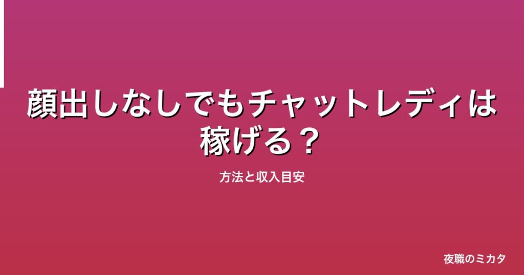 顔出しなしでも稼げる?の基本知識 この記事では「顔出しなしでも稼げる?」について、チャットレディとして活動する際に知っておくべき情報を網羅的に解説します。チャットレディは在宅で24時間好きな時間に働ける仕事で、報酬率は国内サイト(FANZAライ... -