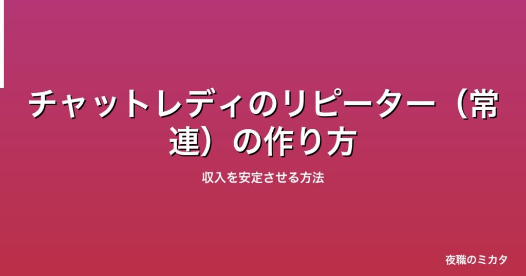なぜリピーターが大事なのか チャットレディの収入は、新規ユーザーよりリピーターで安定します。 | | 新規ユーザー | リピーター | |---|---|---| | 集客コスト | 毎回集める必要がある | 自分から来てくれる | | 単価 | 低い(様子見) | 高い(信頼関係... -