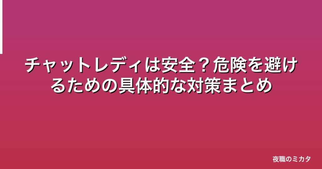 チャットレディの「危険」は対策できる 「チャットレディって危なくないの?」 これは、始める前に一番多い質問です。正直に言えば、リスクはゼロではありません。 でも、ほとんどのリスクは事前の対策で防げます。 この記事では、チャットレディに起こり...