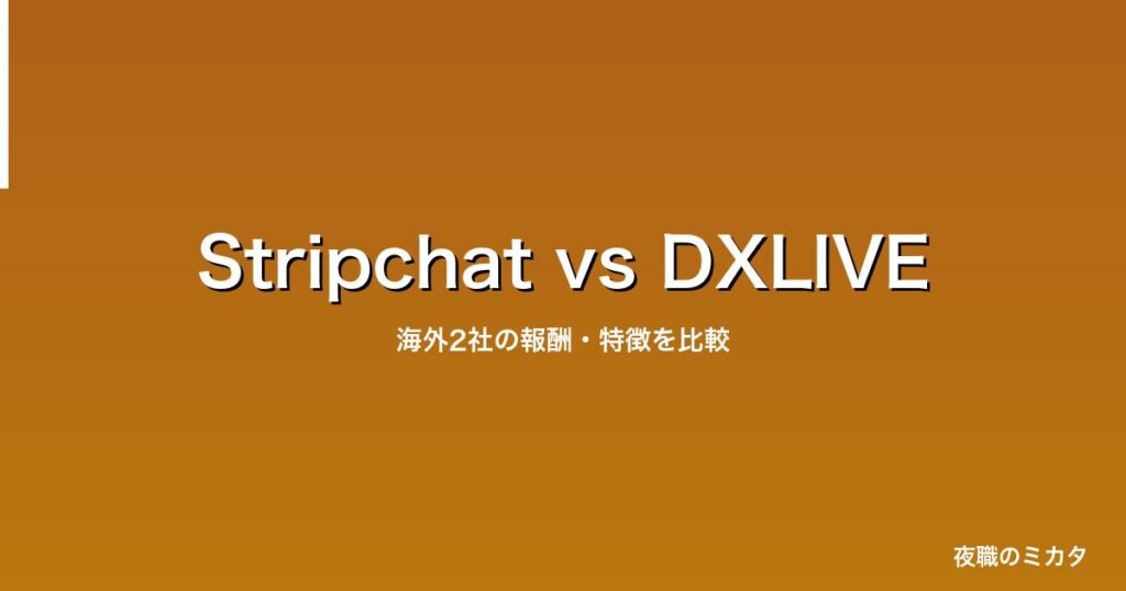 基本比較 | 項目 | Stripchat | DXLIVE | |------|-----------|--------| | 報酬体系 | チップ制(1tk=$0.05) | 分給制(1pt=$2) | | 還元率 | 55%以上 | 30%(個人) | | 2ショット時給 | チップ次第 | 約11,880円 | | 言語 | 翻訳機能(日本語OK) | ... -