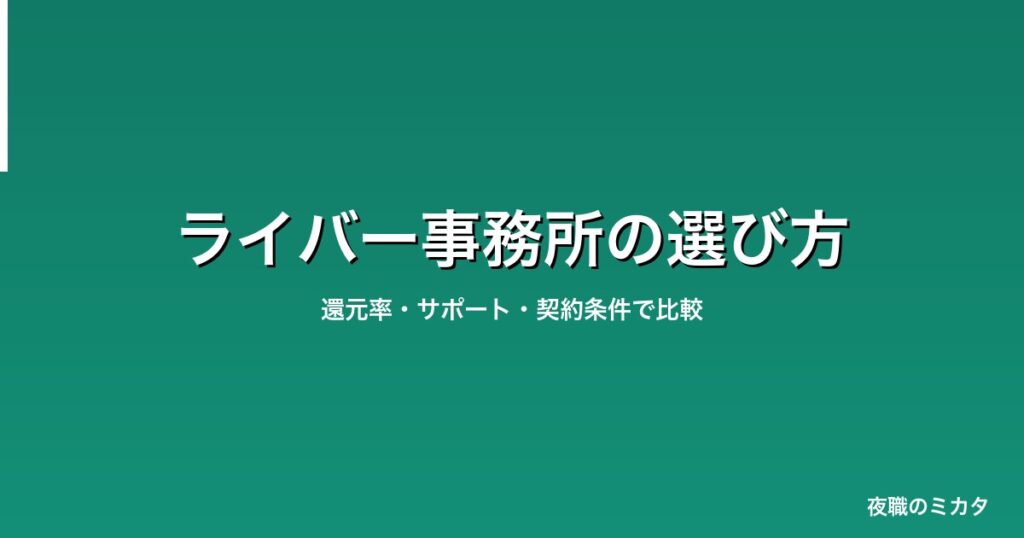 ライバー事務所の選び方を還元率・サポート内容・契約条件の3軸で解説。100%還元の仕組み・違約金の相場・面接で必ず聞くべき質問5つをまとめました。