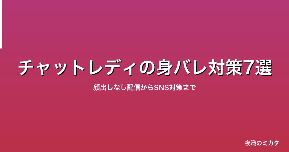 チャットレディを始めるときに一番気になるのが「身バレ」ではないでしょうか。「職場の人に知られたら?」「SNSで特定されたら?」——実際に配信している立場から言うと、正しい対策を取れば身バレのリスクはかなり下げられます。このページでは、チャトレ経験者の視点から7つの対策を具体的にまとめました。