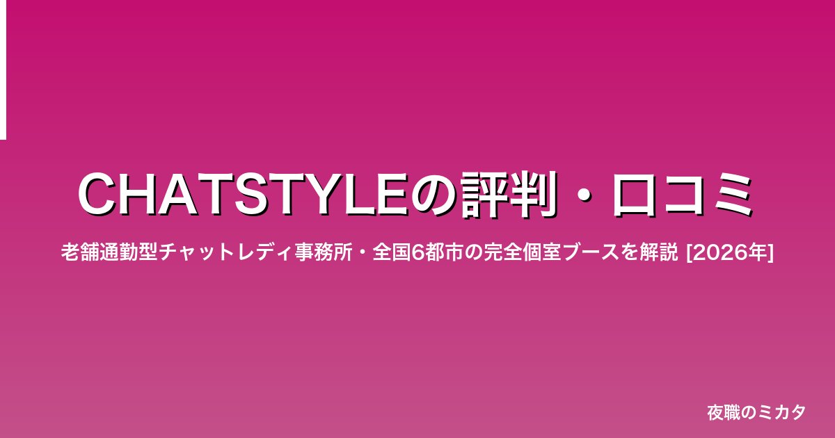 「CHATSTYLE(チャットスタイル)」は、全国6都市に完全個室ブースを持つ老舗の通勤型チャットレディ事務所です。運営は株式会社RTK。長年の運営実績から主要サイトとの交渉力に定評があり、「高品質な設備で本格的に稼ぎたい」「通勤しながら効率よく稼ぎたい」という方に支持されています。在宅と通勤のハイブリッド利用も可能で、ライフスタイルに合わせた柔軟な働き方ができます。この記事ではCHATSTYLEの報酬・口コミ・向いている人を詳しく解説します。