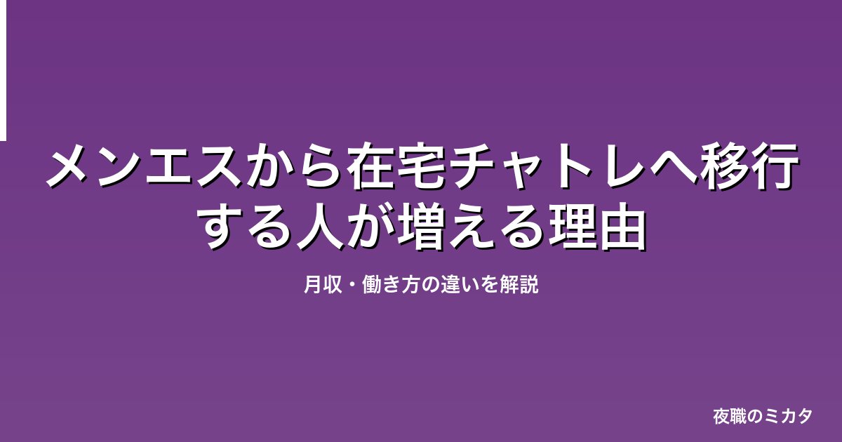 メンズエステから在宅チャットレディへの移行は、身体的な負担を限界まで感じた施術者の間で増加している。業界経験者の移行事例を見ると、腱鞘炎・腰痛などの職業病リスクから解放されながら月収水準を維持できているケースが多い。この記事では、メンエスとチャトレの働き方・月収の違いを、移行者データをもとに解説する。