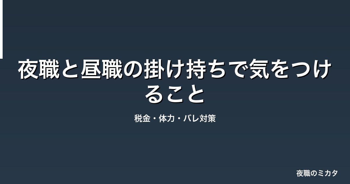 「昼職をしながら夜職を始めたい」「掛け持ちでお金を早く貯めたい」という人は多いですが、実際に掛け持ちをしてみて「思っていたよりしんどかった」という声もよく聞きます。税金・体力・バレ対策の3点を事前に把握しておけば、掛け持ちを長く続けることができます。このページでは、実際に掛け持ちを経験した視点からリアルな注意点をまとめました。